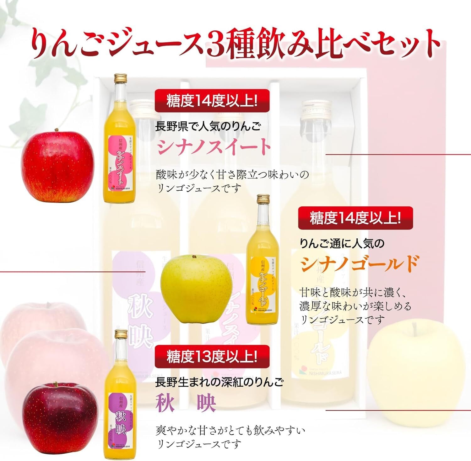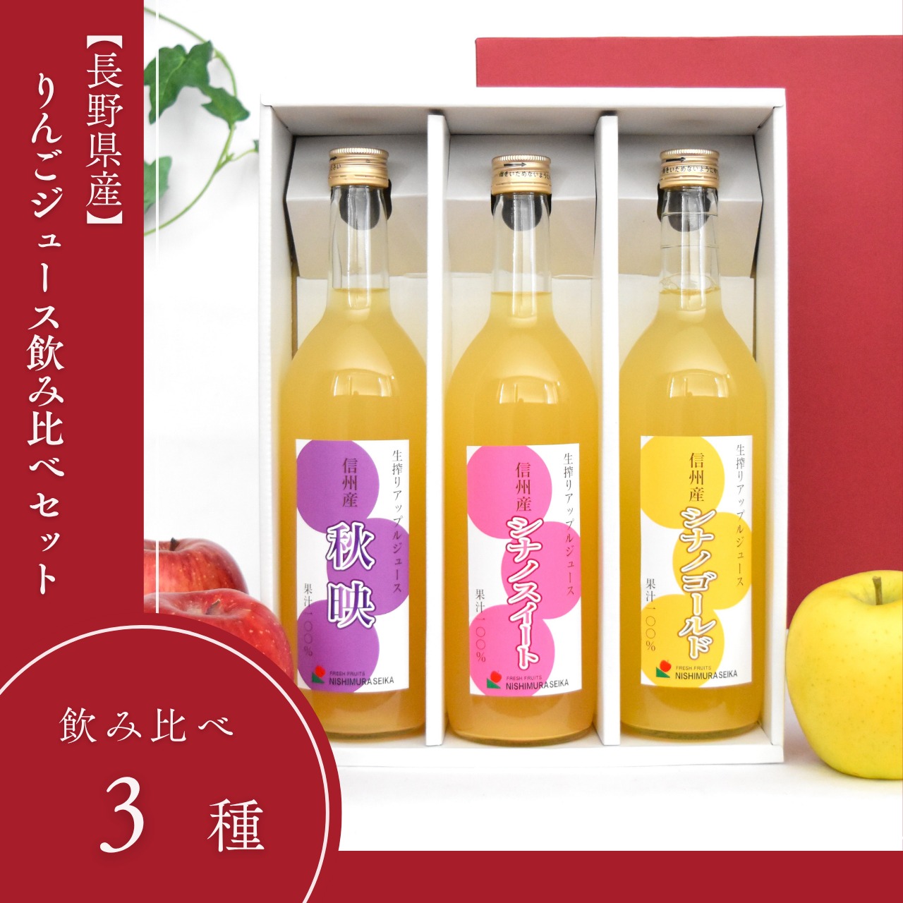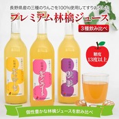 長野県産の3種類の完熟りんごを100%使用してすりおろした本格的な林檎ジュース飲み比べセットです