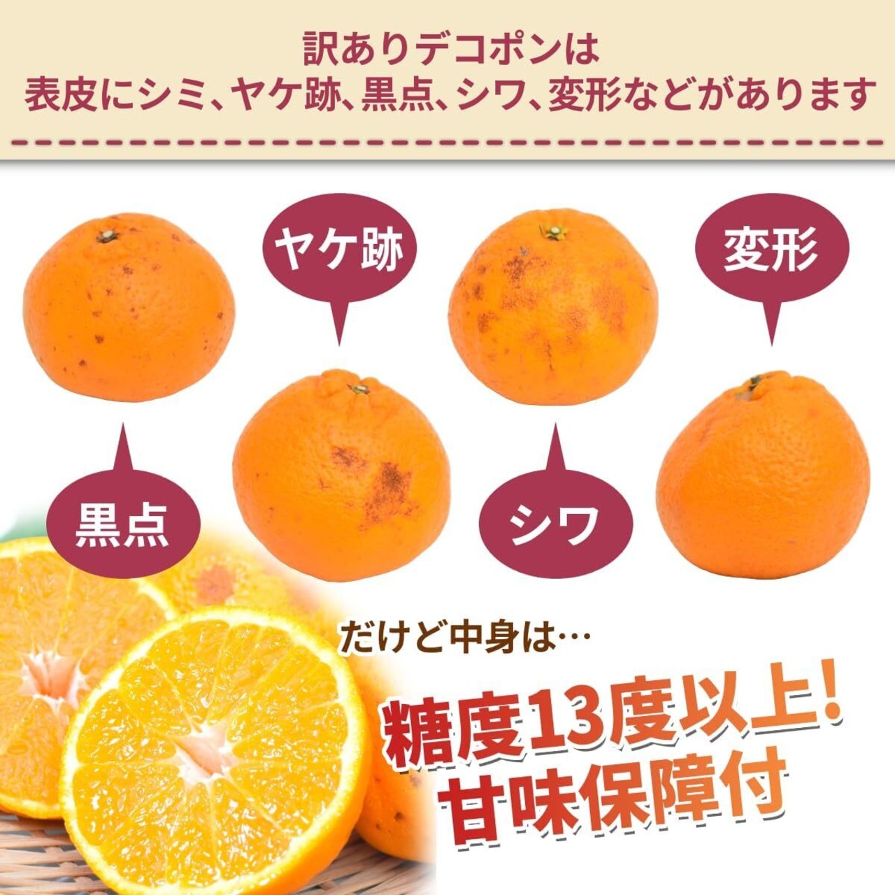 表皮にシミ、ヤケ跡、黒点、シワ、変形などがありますご家庭用の訳ありデコポンです。