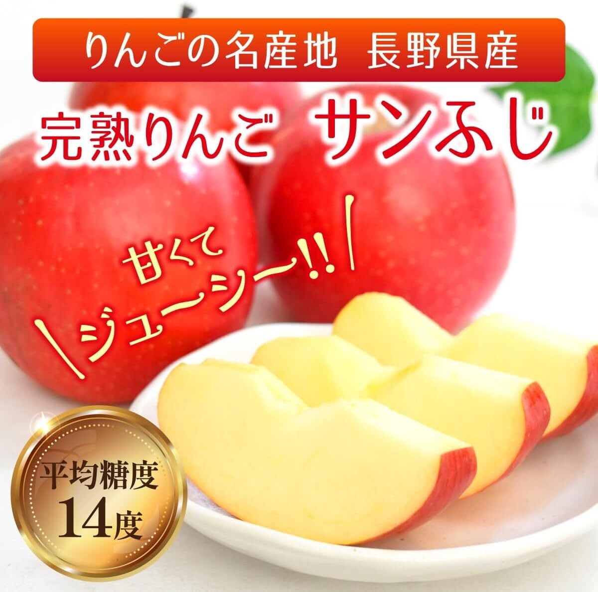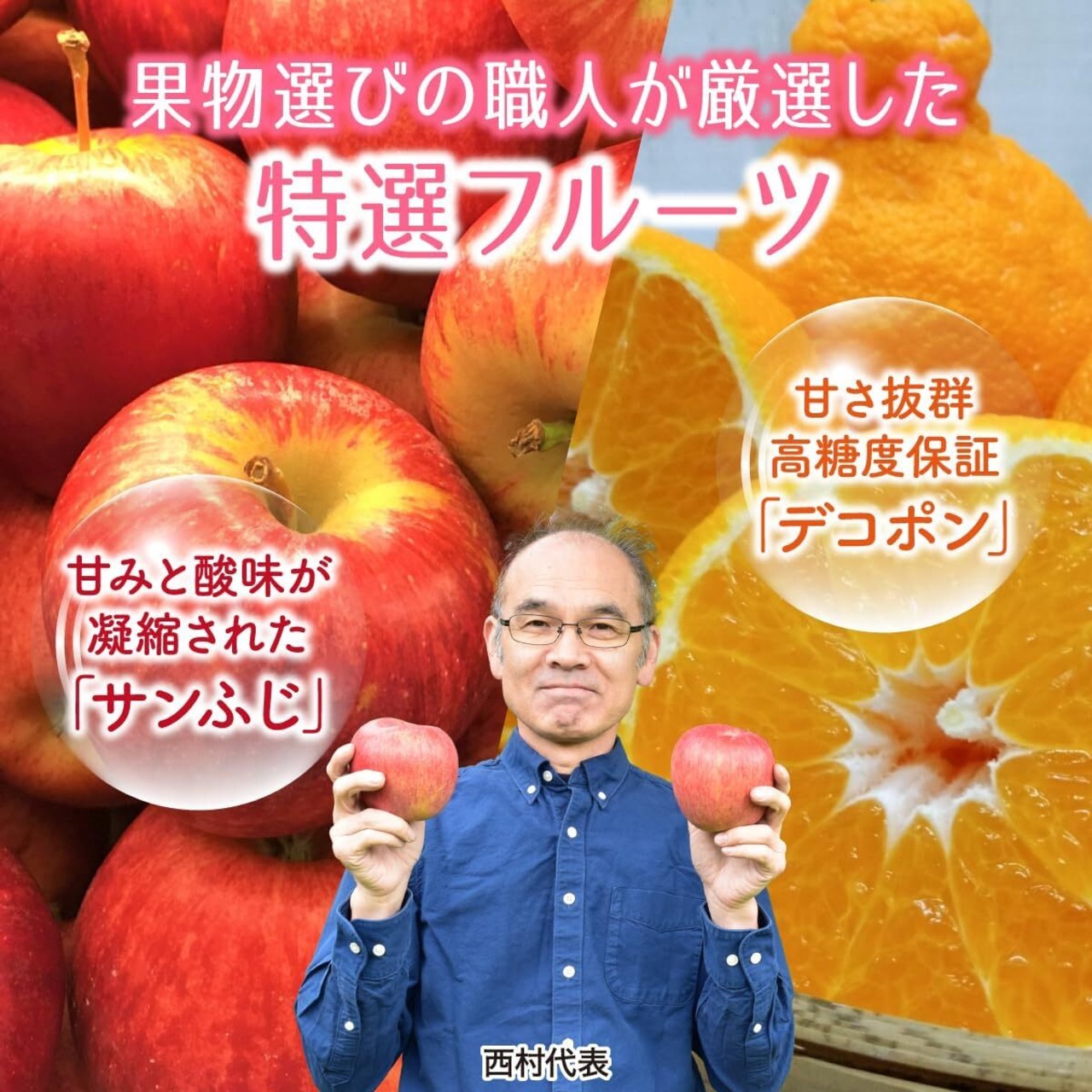 サンふじは長野県産の糖度14度前後の完熟りんご、デコポンは熊本県産等の糖度13度以上のデコポンで、共に甘みたっぷりのフルーツになります。