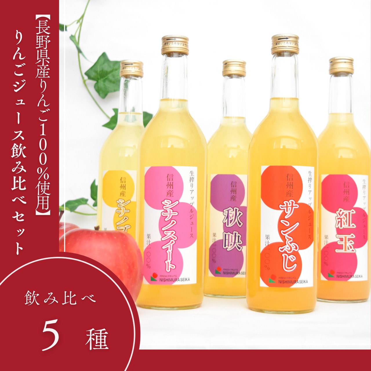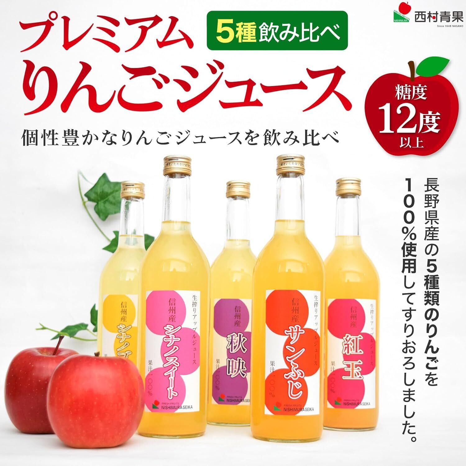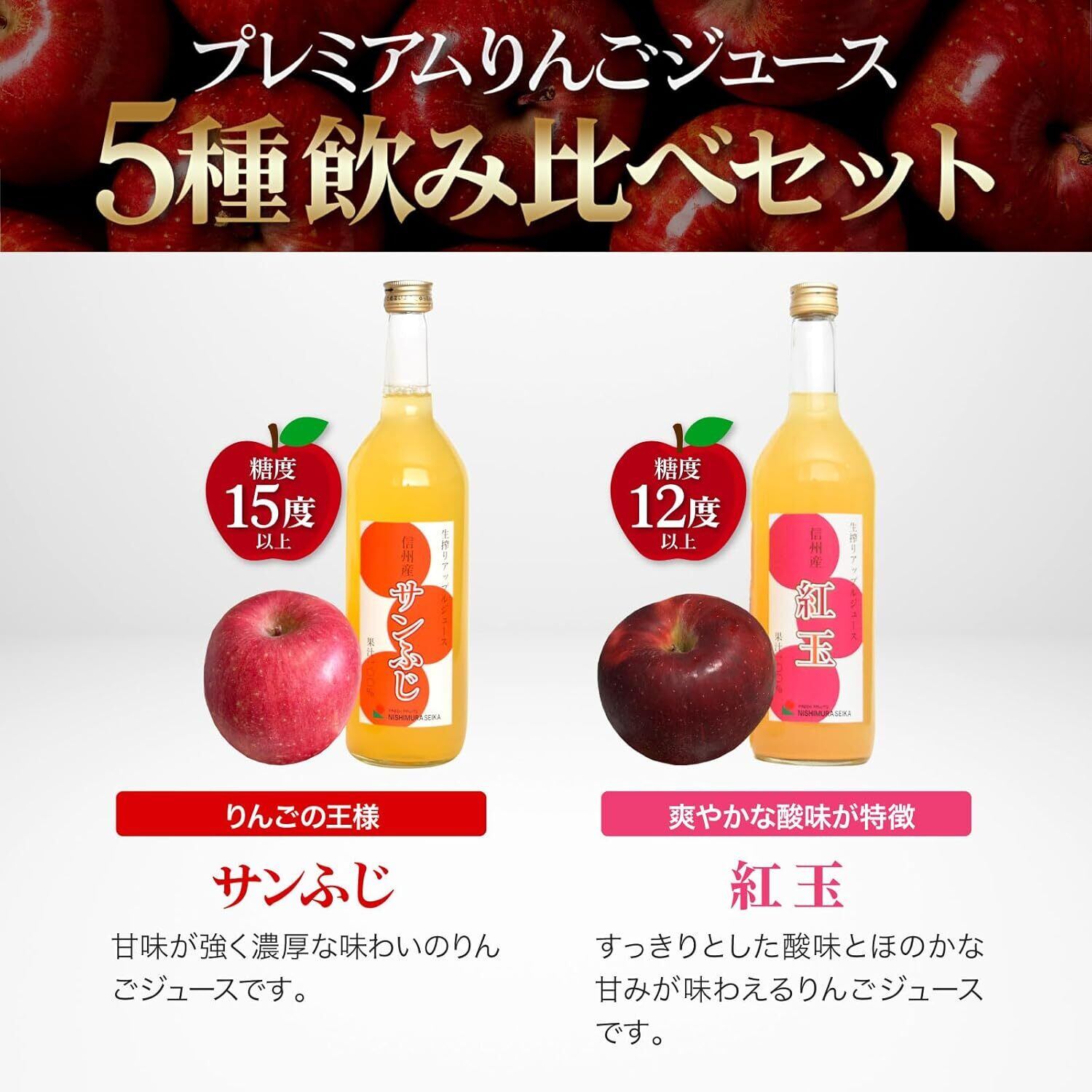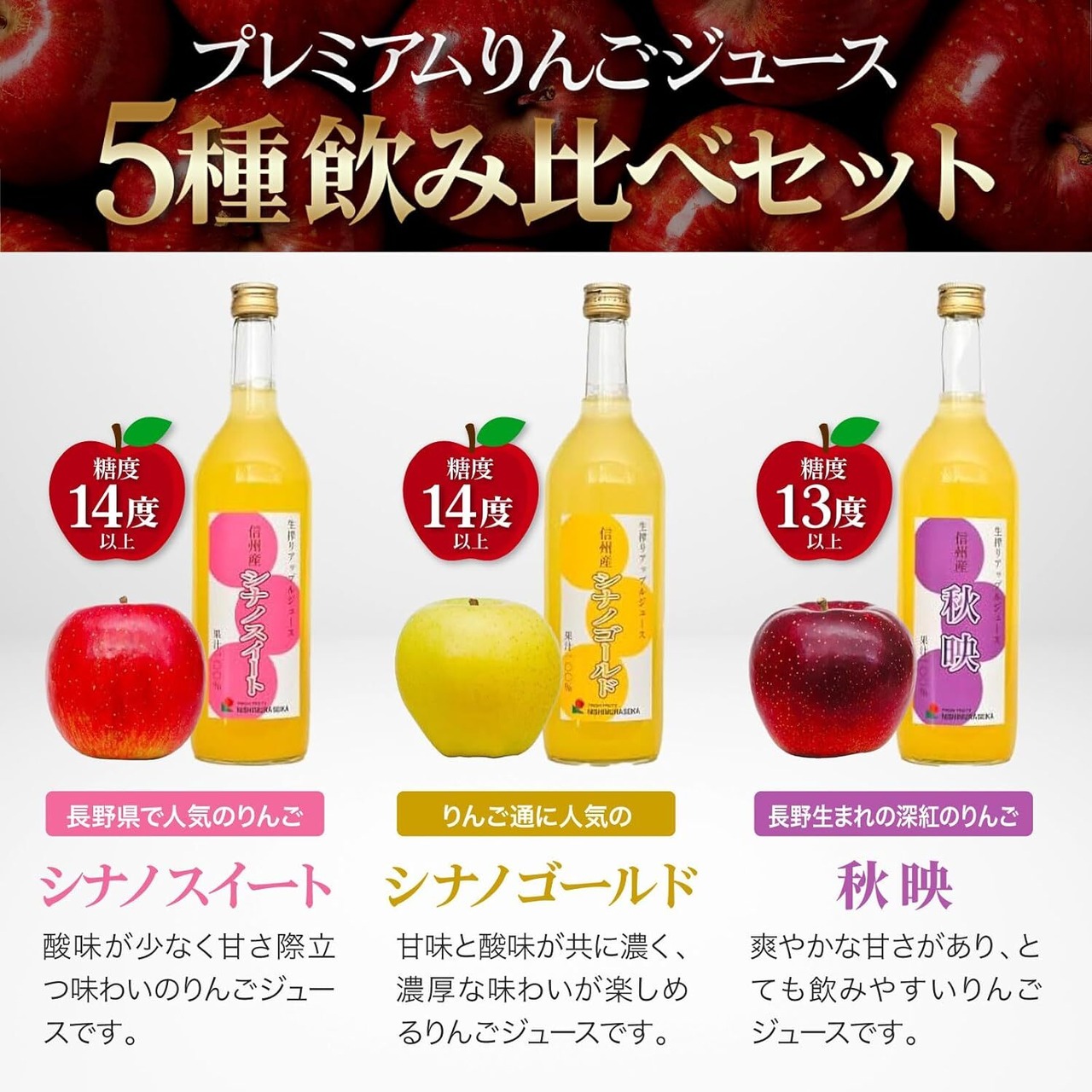 【糖度14度以上】 糖度14度以上 りんごジュース 飲み比べセット 720ml 5本 長野県産 (シナノスイート シナノゴールド 映 サンふじ 紅玉) 果汁100% ストレート リンゴジュース 化粧箱入 ギフト プレゼント 西村青果