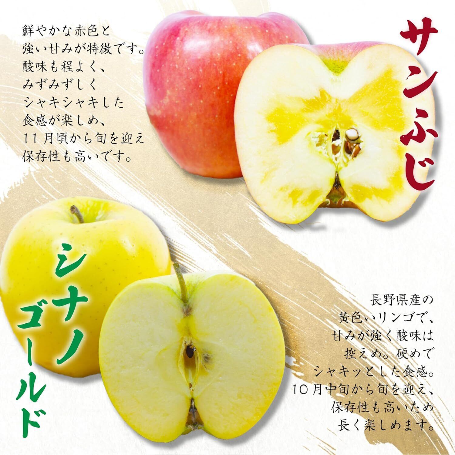 りんご選びの職人が美味しい長野県産の厳選サンふじとシナノゴールドを詰め合わせ、新鮮で高品質な果実を高級感のある化粧箱に入れてお届けします。家族や友人と分け合えるボリュームで、贈答用にも最適な満足感と美味しさを実感できます。