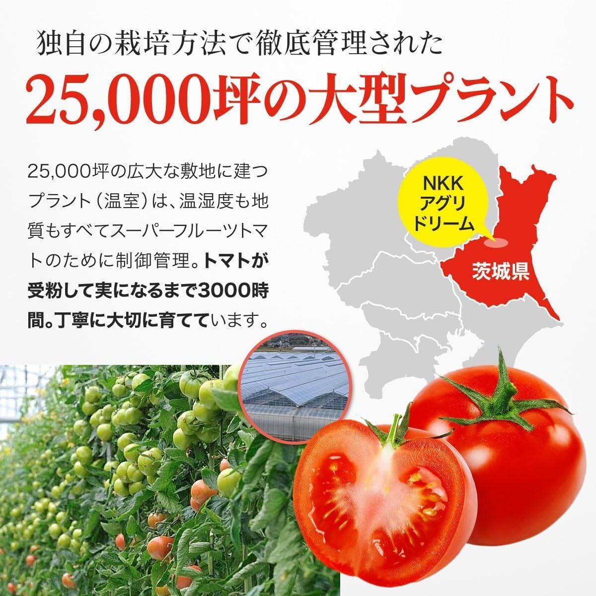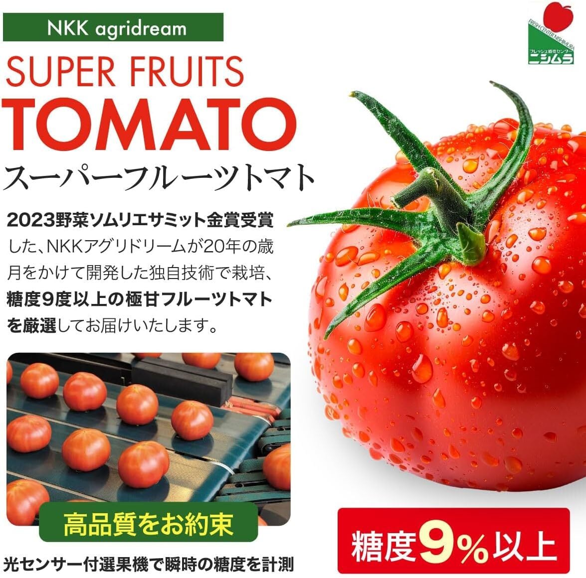 スーパーフルーツトマト(NKKアグリドリーム)は、糖度9度以上の極甘トマトのみを厳選した高品質な逸品です。まるでフルーツのような濃厚な甘さが特徴で、20年以上の研究開発による独自の栽培技術によって生み出されました。茨城県のNKKアグリドリームが手掛け、2019年の野菜ソムリエサミットで金賞を受賞した実績も誇ります。さらに、光センサーを用いて一つ一つ糖度を測定し、基準を満たしたものだけを選別。小粒ながらも甘みが凝縮されたトマトを、1箱約900g(10~12個入り)でお届けします。